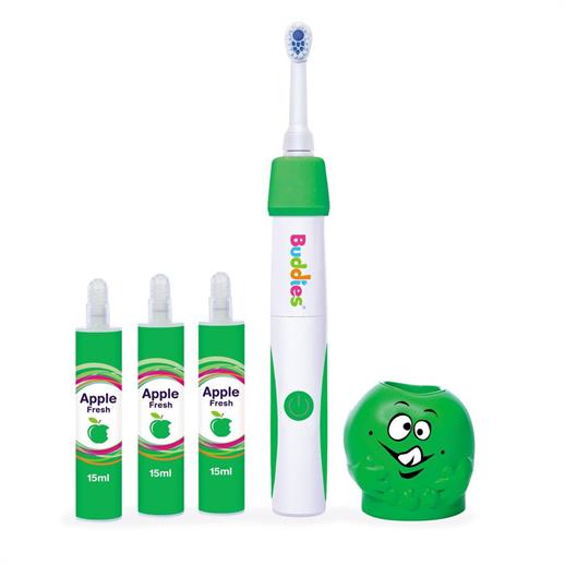 Head gently vibrates for two minutes, getting children used to the sensation of electric toothbrushes. Toothbrush cartridge (15ml) fit in the toothbrush handle and when pushing down on the collar of the brush automatically dispenses the right amount of toothpaste onto the bristles that is recommended for small children. The charging base not only charges the toothbrush, it also lights up with a comforting glow, as a night-light for a child''s bedroom. Comes with three 15ml cartridges (approx. six weeks'' supply).