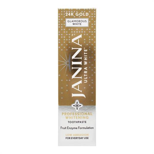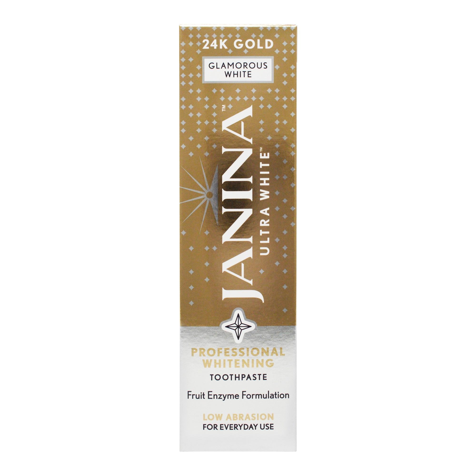 Janina Ultra White Glamorous White Toothpaste, is an innovative fresh gel formula with gold particles for a visibly whiter smile. Gently removes stubborn surface stains using the power of fruit enzymes for gentle but effective teeth whitening. Our unique, low abrasion, gel formula cleans, refreshes and brightens your smile.